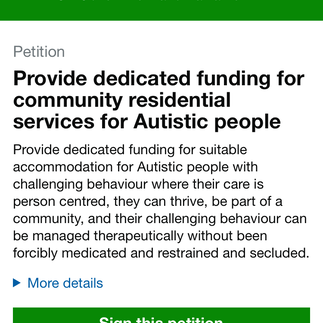 I need as many signatures as possible to reach parliament. Beths been on picu mostly for almost 3 years. Because of ‘challenging behaviour’ due to environment and not accessing the right support, she is deemed not safe to be let out. Now, if she were a criminal and had robbed, stabbed or worse, there would be funding to reform to get back in the community. Criminals get more rights than Autistic people who deserve so much better!
